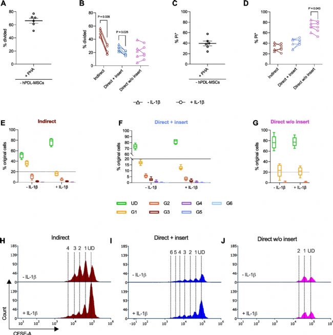 CD4+ T淋巴細(xì)胞與未處理或IL-1β 處理的hPDL-MSCs孵育5 天后,基于CFSE(A、B、E-J)和PI(C、D)染色,流式細(xì)胞術(shù)檢測增殖和活力。