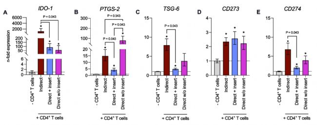 最后,實(shí)驗(yàn)還研究了不同類型共培養(yǎng)實(shí)驗(yàn)結(jié)束時(shí) hPDL-MSCs 中免疫介質(zhì)基因表達(dá)的水平。與單培養(yǎng)相比,無論使用何種體外共培養(yǎng)模型,hPDL-MSCs 中所有研究的免疫介質(zhì)的基因表達(dá)水平都顯著增加(圖3 A-E),但無插入物的直接共培養(yǎng)中的 TSG-6 除外(圖3 C)。IDO-1(圖3 A)、TSG-6(圖3 C)和 CD274 (圖3 E)的水平在兩種直接共培養(yǎng)模型中降低。此外,PTGS-2 基因表達(dá)(圖3 B)在有插入物的直接共培養(yǎng)模型中顯著降低,相比之下,無插入物的直接共培養(yǎng)模型導(dǎo)致 PTGS-2 水平顯著增加。CD273 在各種體外共培養(yǎng)模型之間未觀察到差異(圖3 D)。這些數(shù)據(jù)表明,共培養(yǎng)模型的類型會影響 hPDL-MSCs 中免疫介質(zhì)基因表達(dá)。
