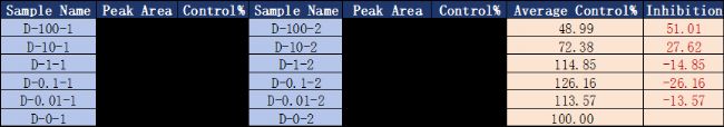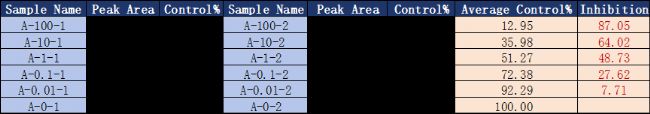 如上表所示,兩組數(shù)據(jù)分別是IPHASE驗(yàn)證某待測(cè)物是否對(duì)某兩個(gè)亞型酶具有抑制作用?砂l(fā)現(xiàn)第一組數(shù)據(jù)隨著待測(cè)物濃度的增加,其抑制率隨之增高,說(shuō)明該待測(cè)物對(duì)某亞型酶具有抑制性;第二組數(shù)據(jù)則無(wú)明顯受濃度影響變化,則可推斷待測(cè)物對(duì)該亞型酶無(wú)抑制效果(注:IPHASE內(nèi)部默認(rèn)抑制率結(jié)果在±20%之內(nèi)即為無(wú)抑制作用)。