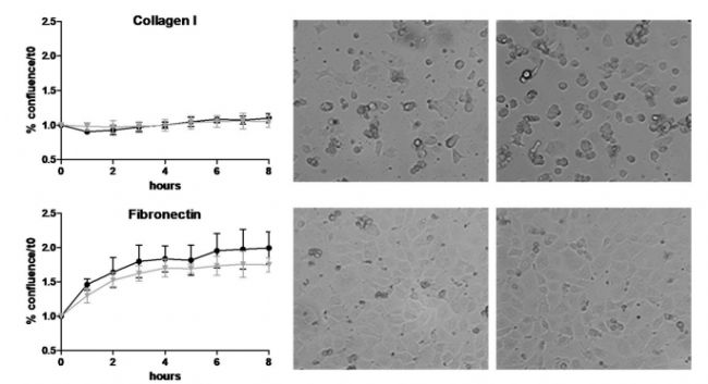 在這篇文章中,研究者將細胞接種在5 μg/mL的纖連蛋白(mock/shRNASET2-OAW42)或5 μg/mL的 I 型膠原 (mock/tRNASET2-SKOV3)的包被上,使用JuLI™ Stage活細胞成像分析系統(tǒng)監(jiān)測細胞黏附情況,共拍攝8h。拍攝結(jié)束后使用儀器自帶的分析軟件計算細胞的融合度并繪制曲線。結(jié)果表明細胞能夠粘附纖維連接蛋白,但不能粘附膠原蛋白[3]。