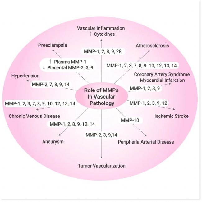 此外,MMP-2 和 MMP-9 在慢性腎臟疾病中發(fā)揮作用。動(dòng)脈粥樣硬化的疾病進(jìn)展與 MMP-2 和 MMP-9 介導(dǎo)的平滑肌細(xì)胞增殖和遷移直接相關(guān)。MMP-9 還被提議作為阿爾茨海默病和 2 型糖尿病治療靶點(diǎn)。神經(jīng)元 MMP-9 通過(guò)控制樹(shù)突棘的形狀和興奮性突觸的功能參與突觸的可塑性,從而在學(xué)習(xí)、記憶和皮層可塑性中發(fā)揮關(guān)鍵作用。如果釋放不當(dāng),MMP-9 會(huì)導(dǎo)致多種腦部疾病,包括癲癇、精神分裂癥、自閉癥、腦損傷、中風(fēng)、神經(jīng)退行性變、疼痛、腦腫瘤等。MMP-1 與 MMP-12 基因多態(tài)性與缺血性腦中風(fēng)相關(guān)。