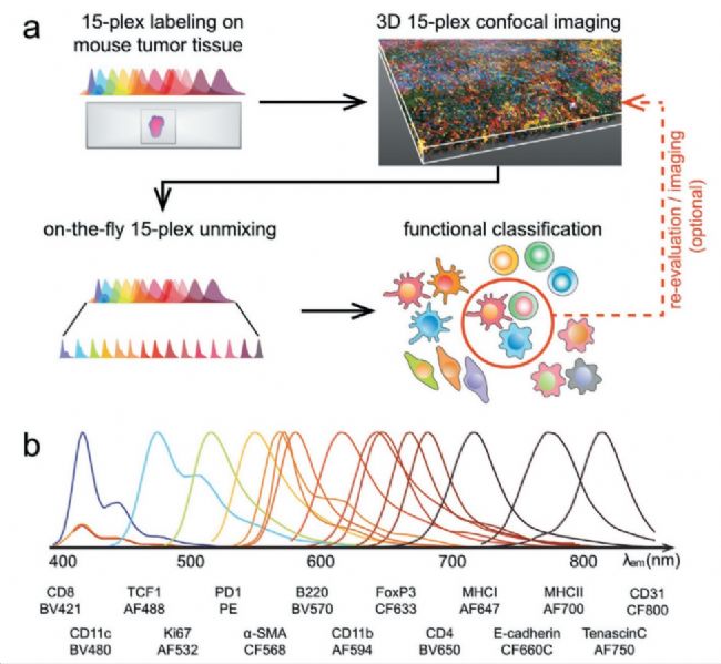 上述過程由分子和細胞之間復雜的相互作用驅動。因此,使用熒光成像研究這些過程的實驗設計需要能夠區(qū)分和定位大量標記物,由抗體識別并與合適染料結合的靶抗原。