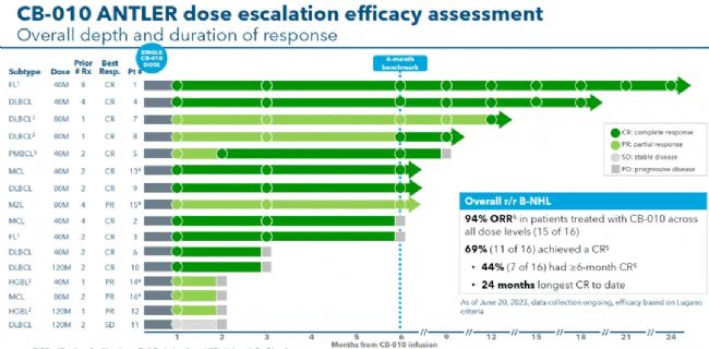 還有CRISPR Therapeutics的通用型CD19 CAR-T,其通用型的CTX110的數(shù)據(jù)來看,整體CR率較低,DoR應(yīng)該也不如自體CAR-T。