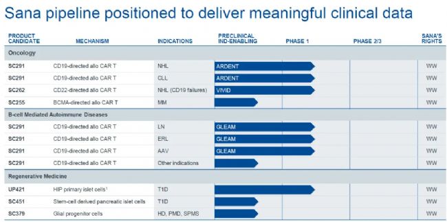 Sana Biotechnology也是通用型CAR-T領(lǐng)域的主要玩家,首發(fā)管線SC291處于1期臨床階段。