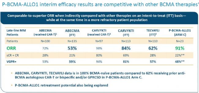 P-BCMA-ALLO1的CR相比于同類競(jìng)品仍然比較低,且mDoR只有不到8個(gè)月(232天),而自體的Abecma和Carvykti分別為11.0個(gè)月和21.8個(gè)月。
