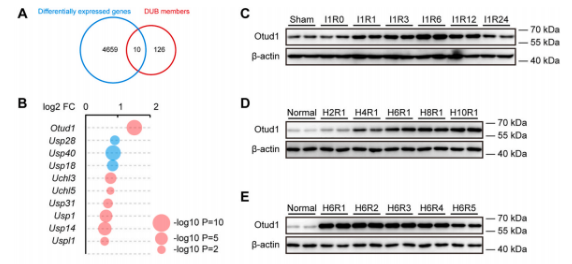 通過比較I/R組和假手術(shù)組,使用差異倍數(shù)>1.5和p < 0.05來篩選差異表達(dá)基因(DEGs)。從上述DEGs和DUB成員中進(jìn)一步篩選出共同的基因(下圖A)。在這些差異表達(dá)的DUB基因中,Otud1是增加最顯著的成員(下圖B)。