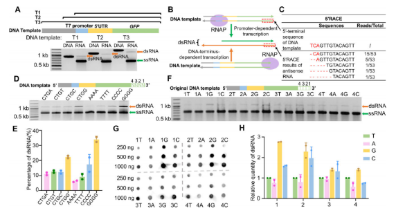研究團(tuán)隊(duì)進(jìn)一步檢測了4- bp(5’-TTTT-3’)模板末端序列的單一變異對dsRNA產(chǎn)生的影響。體外轉(zhuǎn)錄產(chǎn)物采用瓊脂糖凝膠電泳(上圖F)和斑點(diǎn)blot分析(上圖G)。然后對這些模板中的dsRNA進(jìn)行量化,并將其與原始模板中的dsRNA進(jìn)行了比較(上圖H)。結(jié)果表明,后兩個堿基對dsRNA的生成影響最為顯著,在末端2-nt區(qū)域的單個鳥苷或胞苷可以提高dsRNA的產(chǎn)量。