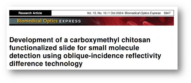 文章題目為“Development of a carboxymethyl chitosan functionalized slide for small molecule detection using oblique-incidence reflectivity difference technology”于2024年9月發(fā)表在Biomedical Optics Express雜志,作者來自于上海復旦大學的信息科學與技術學院微納米光子結(jié)構(gòu)教育部重點實驗室。為了提高OI-RD對小分子(通常< 500 Da)的檢測能力,作者開發(fā)了一種以羧甲基殼聚糖(CMCS)和戊二醛(GA)交聯(lián)劑功能化修飾的三維生物芯片。蛋白樣品溶解在HEPES(pH 7.5)緩沖液中,濃度為0.5 mg/mL,隨后使用英國ArrayJet生物芯片點樣儀進行點印(Super Marathon 對應新型號Mercury 100-S),玻片被分成10個重復區(qū)域,每個區(qū)域為8 × 8陣列,點樣體積100pL,點間距300 μm,點樣溫度20 ℃ 、濕度50%。(芯片制備流程和檢測 如圖1,下圖加上標注)