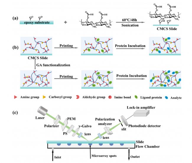 圖1:(a) CMCS環(huán)氧玻片功能化修飾示意圖。(b)利用CMCS玻片進行生物分子打印示意圖。(c)OI-RD檢測系統(tǒng)原理圖