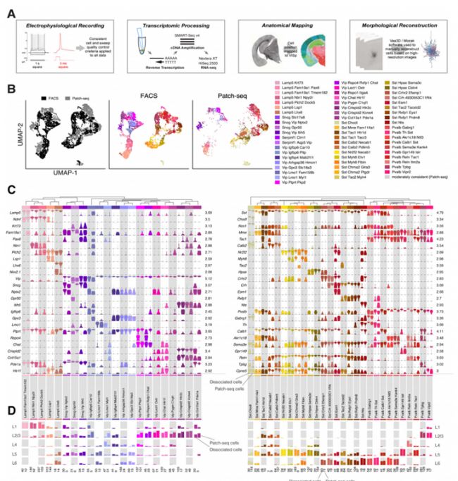 本文通過Patch-seq技術(shù)收集了超過4,200個(gè)小鼠視覺皮層GABA能中間神經(jīng)元的數(shù)據(jù),包括超過500個(gè)神經(jīng)元的形態(tài)重建。利用SMAR-Seq v4進(jìn)行RNA測序,并通過Patch-seq記錄單個(gè)神經(jīng)元的轉(zhuǎn)錄組和電生理特性。