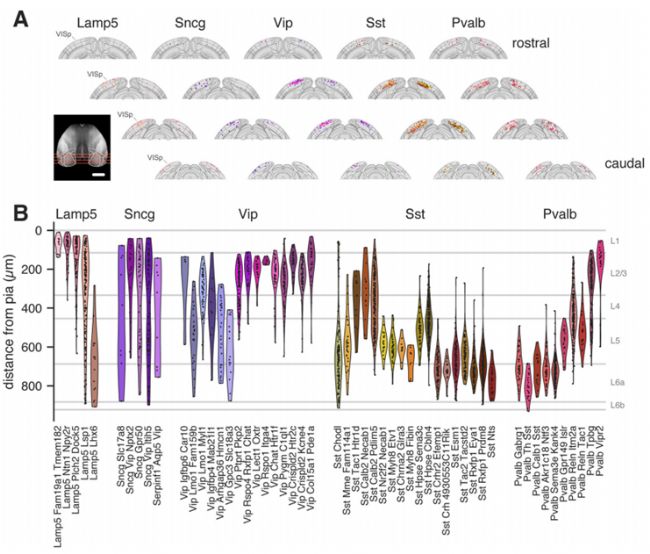 研究發(fā)現(xiàn),不同t-types在視覺皮層中的位置各異。例如,Sst met-types中的Sst Calb2 Pdlim5型在L2/3層中有顯著的軸突投射,而Sst Tac1 Htr1d型則主要分布在L2/3層。此外,Pvalb met-types中的Pvalb Tpbg型和Pvalb Reln Itm2a型分別在L2/3層和L5層有廣泛的分布。這些發(fā)現(xiàn)揭示了不同met-types在皮層中的精細(xì)定位及其對應(yīng)的電生理特性。