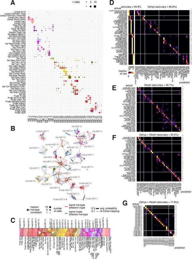 圖5:滿足類型的定義和類型預(yù)測精度。(A)t型與無監(jiān)督聯(lián)合電生理和形態(tài)學(xué)聚類結(jié)果的比較((A)型)。同時(shí)顯示了高度一致和中等一致的細(xì)胞(n=503)。me型/t型組合之間的交叉映射的(B)圖可視化。節(jié)點(diǎn)表示在(A)中具有特定me型/t型組合的細(xì)胞,節(jié)點(diǎn)的大小表示細(xì)胞的數(shù)量。邊緣表示在一個(gè)給定的me型/t型組合中存在的細(xì)胞,它們有一定的概率映射到另一個(gè)t型(橙色線)或me型(藍(lán)色線);較粗的線表示更高的概率。沒有顯示只有一個(gè)單元格和沒有連接的節(jié)點(diǎn)。概述的組表明連接良好的me型/t型組合,形成28個(gè)met類型(方法)。(C) River圖顯示了t型(底部)和相遇型(頂部)之間的關(guān)系。(D)隨機(jī)森林分類器的袋外混淆矩陣,訓(xùn)練后從電生理特征預(yù)測t子類(左)和t類型(右)。只有t型與至少使用了10個(gè)高度一致的映射單元格。(E-F)與(D)相同,但僅從形態(tài)學(xué)特征(E)以及形態(tài)學(xué)和電生理特征來預(yù)測t類型(F)。只使用至少有5個(gè)高度一致的映射細(xì)胞的t型。(G)與(D)相同,但可從形態(tài)學(xué)和電生理特征來預(yù)測met類型。只使用至少有5個(gè)單元格的滿足類型。對于(D-G),這些值被歸一化為行和。