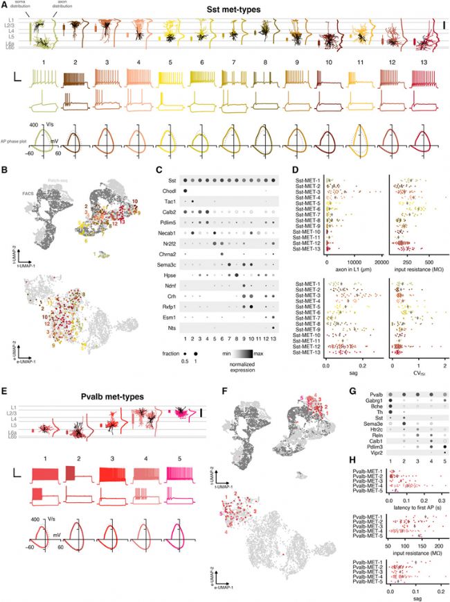 圖6:已鑒定的Sst和Pvalb抑制相遇類型的總結(jié)。(A)每個(gè)Sst相遇類型的形態(tài)和電生理反應(yīng)的例子。在形態(tài)學(xué)圖中,體細(xì)胞分布在左側(cè)的條形圖表示(較厚: 25%至75%范圍,較薄: 5%至95%范圍)。平均軸突深度直方圖顯示在右邊(歸一化到其最大值)。比例尺: 200µm。電生理學(xué)的例子包括超極化電流步驟(−70或−90pA,下)誘發(fā)的反應(yīng),流變基的反應(yīng)(下),以及流變基+ 40 pA刺激誘發(fā)的反應(yīng)(上)。比例尺:垂直50 mV,水平250 ms。流變基軌跡的平均第一個(gè)峰值的相位圖顯示在示例軌跡的下面;子類范圍的平均值是灰色虛線;诨虮磉_(dá)(上圖1B)和電生理特征(下圖3B-c)的(B)UMAPs,Sstmet類型以顏色顯示。在頂部,Patch-seq細(xì)胞顯示為淺灰色,分離的細(xì)胞顯示為深灰色。(C)在Sst相遇類型間差異表達(dá)的標(biāo)記基因的點(diǎn)圖。表達(dá)值(陰影)經(jīng)過對數(shù)轉(zhuǎn)換并歸一化到最大值;點(diǎn)的大小表示在t型內(nèi)表達(dá)該基因的細(xì)胞的比例。(D)通過Sst相遇型選擇形態(tài)學(xué)和電生理特征。平均值顯示為灰色菱形。測量了流變基+ 40 pA振幅響應(yīng)的CVISI(峰間間隔的變化系數(shù))。(E-H)與(A-D)相同,但對于Pvalbmet類型。在(D)中,在流變基處測量了第一個(gè)AP的潛伏期。另請參見圖S6和S7以及表S2和S3。