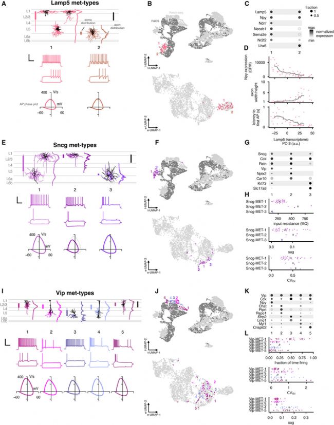 圖7:已鑒定出的Lamp5、Sncg和Vip抑制相遇類型的總結(jié)。(A)每個(gè)Lamp5相遇型的形態(tài)和電生理反應(yīng)的例子。在形態(tài)學(xué)圖中,體細(xì)胞分布在左側(cè)的條形圖表示(較厚: 25%至75%范圍,較。 5%至95%范圍)。平均軸突深度直方圖顯示在右邊(歸一化到其最大值)。比例尺: 200µm。電生理學(xué)的例子包括超極化電流步驟(−70或−90pA,下)誘發(fā)的反應(yīng),流變基的反應(yīng)(下),以及流變基+ 40 pA刺激誘發(fā)的反應(yīng)(上)。比例尺:垂直50 mV,水平250 ms。流變基軌跡的平均第一個(gè)峰值的相位圖顯示在示例軌跡的下面;子類范圍的平均值是灰色虛線。(B) UMAPs基于基因表達(dá)(上圖1B)和電生理特征(下圖3B-C),Lamp5met類型以顏色顯示。在頂部,Patch-seq細(xì)胞顯示為淺灰色,分離的細(xì)胞顯示為深灰色。(C)在Lamp5集合中差異表達(dá)的標(biāo)記基因的點(diǎn)圖類型表達(dá)值(陰影)經(jīng)過對數(shù)轉(zhuǎn)換并歸一化到最大值;點(diǎn)的大小表示在t型內(nèi)表達(dá)該基因的細(xì)胞的比例。(D)Lamp5-MET-1相遇型細(xì)胞流變基掃描中Npy表達(dá)、軸突寬度:高度比和首次AP的潛伏期。數(shù)值與第三個(gè)轉(zhuǎn)錄組主成分(PC-3)相對應(yīng),從4020個(gè)差異表達(dá)基因的第三個(gè)轉(zhuǎn)錄組主成分(PC-3)中計(jì)算出來。灰色線為滾動(dòng)平均值(10個(gè)單元格的窗口)。(E-G)與(A-C)相同,但對于Sncg滿足類型。(H)Sncg元型之間的電生理特征差異。平均值顯示為灰色菱形。測量了流變基+ 40 pA振幅響應(yīng)的CVISI(峰間間隔的變化系數(shù))。(I-K)與(A-C)相同,但對于Vipmet類型。(L)與(H)相同,但對于Vip滿足類型。測量了流變基+ 40 pA振幅響應(yīng)的時(shí)間發(fā)射分?jǐn)?shù)。結(jié)論