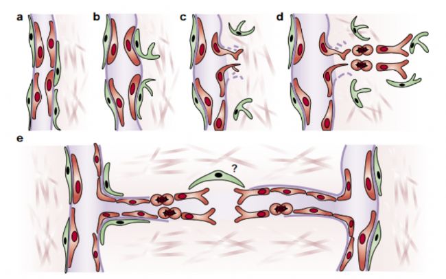 圖4 腫瘤新血管形成過程:腫瘤的血管生成起源于腫瘤中已存在的毛細(xì)血管或毛細(xì)血管后小靜脈。首先,血管周細(xì)胞(綠色)脫落,血管擴(kuò)張;接著內(nèi)皮細(xì)胞(紅色)遷移到血管周圍空間,向腫瘤細(xì)胞或宿主細(xì)胞產(chǎn)生的血管生成刺激方向遷移;然后內(nèi)皮細(xì)胞順著血管生成方向增殖,這一過程可能由周細(xì)胞引導(dǎo);內(nèi)皮細(xì)胞相互粘附并形成一個(gè)管腔,并伴隨著基底膜的形成和周細(xì)胞的附著。最后,血管芽會(huì)與其他芽融合,建立新的循環(huán)系統(tǒng)。