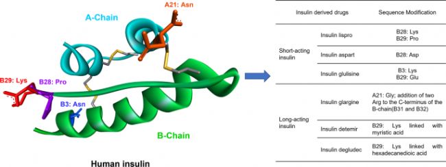 圖1. 人胰島素和人胰島素衍生藥物的結(jié)構(gòu)。上:人胰島素的結(jié)構(gòu)(左,PDB:1XDA)。對(duì)其殘基進(jìn)行修飾(B 鏈:B3:Asn、B28:Pro、B29:Lys;A 鏈:A21:Asn)產(chǎn)生了幾種短效和長(zhǎng)效胰島素藥物(下表)。