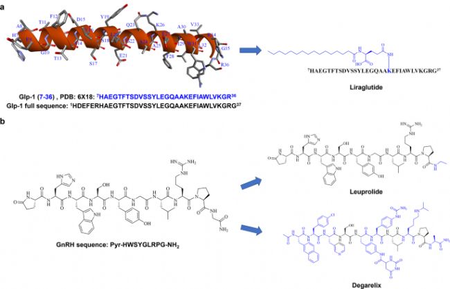 GLP-1衍生肽藥物(圖 2a ):GLP-1是一種37個(gè)氨基酸的肽,調(diào)節(jié)胰島素的產(chǎn)生和分泌,在體內(nèi)半衰期非常短。研究人員付出了大量的努力來修改其序列,以增強(qiáng)這種激素的穩(wěn)定性,同時(shí)保持其效力和藥理作用,從而開發(fā)了目前三種最暢銷的多肽藥物:Trulicity(杜拉魯肽,dulaglutide)、Victoza (利拉魯肽,liraglutide)和 Ozempic(索馬魯肽,semaglutide)。