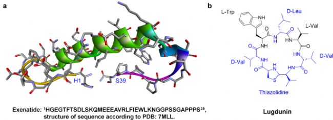 圖3. 艾塞那肽 ( a ) 和lugdunin ( b )。
