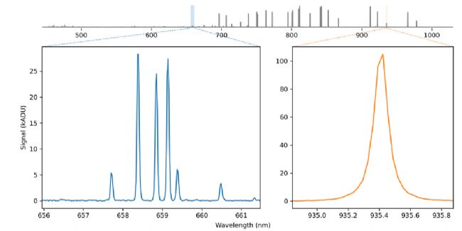 下圖展示了RS40k中階梯光柵光譜儀的性能。每個光譜都是在一次拍攝中獲得的,包含430-950 nm的數(shù)據(jù)。某些光譜被限制在其范圍內(nèi),以更詳細(xì)地顯示特別有趣的特征。