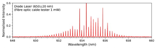 二極管激光器發(fā)射的光束通常具有很小的波長范圍,稱為激光線寬。這是由于在激光二極管的諧振腔內(nèi)同時發(fā)生多種不同模式的振蕩。這些可以包括縱向和橫向模式,導(dǎo)致多模激光二極管。下圖顯示了一種廉價光纖故障檢測器的光譜,其中心峰波長為650±20 nm。