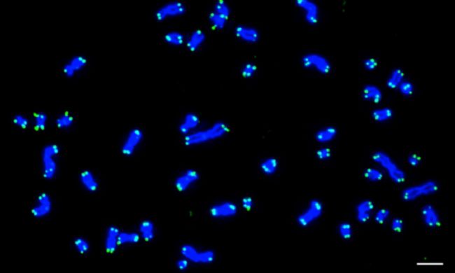 圖2.人類細胞的染色體組型,該細胞在分裂中期含有46條染色體。DNA以DAPI染色(藍)并通過使用PNA-TeIC探針(綠)以FISH檢測端粒。由于每條染色體含有兩個染色單體,并且每個染色單體中都包含兩個端粒,因此共觀察到184個雜交探針。(圖像比例尺=5μm)