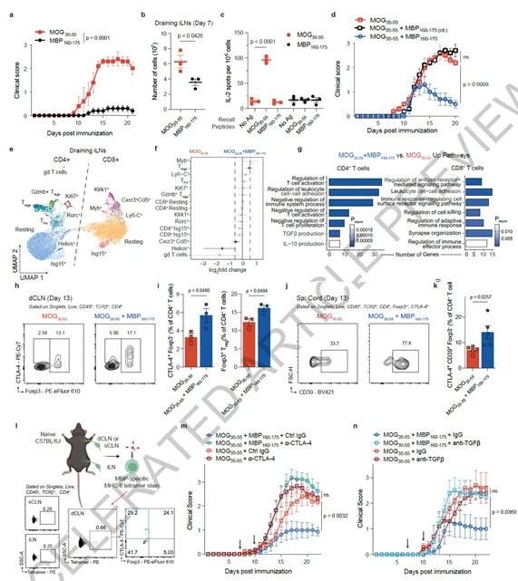 接下來(lái)作者重點(diǎn)研究了MBP160-175的潛在免疫抑制機(jī)制,分別從MOG35-55和MOG35-55+ MBP160-175免疫后的小鼠腹溝引流淋巴結(jié)(iLNs)中分離出163個(gè)T細(xì)胞,然后進(jìn)行10X Genomics單細(xì)胞RNA測(cè)序(scRNA-seq),結(jié)果差異基因表達(dá)可分辨出CD4+和CD8+T細(xì)胞的15個(gè)不同的細(xì)胞簇(圖2e)。其中,調(diào)節(jié)性Foxp3+CD4+ T細(xì)胞和活化的Cxcr3+Ccl5+CD8+T細(xì)胞表現(xiàn)出明顯差異,這兩種細(xì)胞在自身免疫性疾病中發(fā)揮重要作用。當(dāng)MOG35-55 + MBP160-175聯(lián)合免疫時(shí),調(diào)節(jié)性Foxp3+CD4+ T細(xì)胞顯著增加,而Cxcr3+Ccl5+CD8+T細(xì)胞群明顯衰減(圖2f),表明MOG35-55 + MBP160-175的上游調(diào)控,如T細(xì)胞活化和增殖的負(fù)調(diào)控以及促進(jìn)抑制性細(xì)胞因子(IL-10和TGF-β)的產(chǎn)生(圖2g-i)。MBP160-175免疫小鼠的脊髓中CD39表達(dá)顯著增加,這表明其通過(guò)消耗細(xì)胞外的ATP來(lái)增強(qiáng)抗炎活性(圖2j,k)[4],并且在疾病消退期間持續(xù)存在。