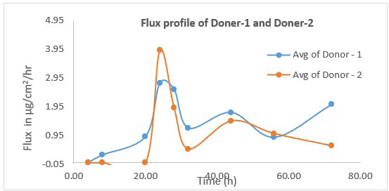 圖1和圖2展示了每個(gè)時(shí)間間隔使用部分取樣的IVPT數(shù)據(jù)。觀察到供體內(nèi)部變異性,但供體內(nèi)變異性僅為完荃替換對(duì)照的三分之一(%RSD < 5.0)。兩個(gè)供體的總體結(jié)果表明,阿昔洛韋霜的AUC(0-72小時(shí))分別為102 µg/cm²和64.4 µg/cm²。阿昔洛韋霜的Jmax分別為2.8 µg/cm²/h和3.9 µg/cm²/h。Tmax為兩個(gè)供體均為24小時(shí)。在完荃替換中可能會(huì)存在高變異性,因?yàn)槊看稳狱c(diǎn)的藥物濃度非常低,這導(dǎo)致許多分析接近定量下限(LLOD)。然而,部分替換穩(wěn)定允許接收液中的活性藥物濃度增加,使用HPLC系統(tǒng)作為分析技術(shù)提供了更好的結(jié)果,因?yàn)榉治鰞x器在檢測范圍內(nèi)運(yùn)行,使得結(jié)果更加一致。