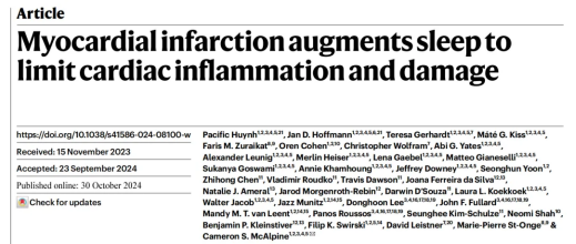 2024年10月30日西奈山伊坎醫(yī)學(xué)院Cameron S. McAlpine研究團(tuán)隊在Nature雜志上發(fā)表文章揭示缺血性心臟損傷通過促進(jìn)單核細(xì)胞浸潤入腦引起睡眠紊亂,睡眠缺失可通過促進(jìn)心臟免疫細(xì)胞異常聚集加重心臟炎癥反應(yīng)。