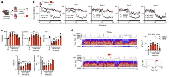 健康雌性小鼠表現(xiàn)出規(guī)律性慢波睡眠活動(SWS,70%出現(xiàn)在日間非活躍期,20%出現(xiàn)在夜間活躍期),動脈粥樣硬化模型小鼠具有更多的SWS,出現(xiàn)睡眠紊亂。MI模型小鼠在損傷后第一天出現(xiàn)不規(guī)律的的SWS,并可持續(xù)1周,并出現(xiàn)睡眠增多的活性降低、體溫下降等癥狀,表明心血管疾病損傷可引起睡眠紊亂。