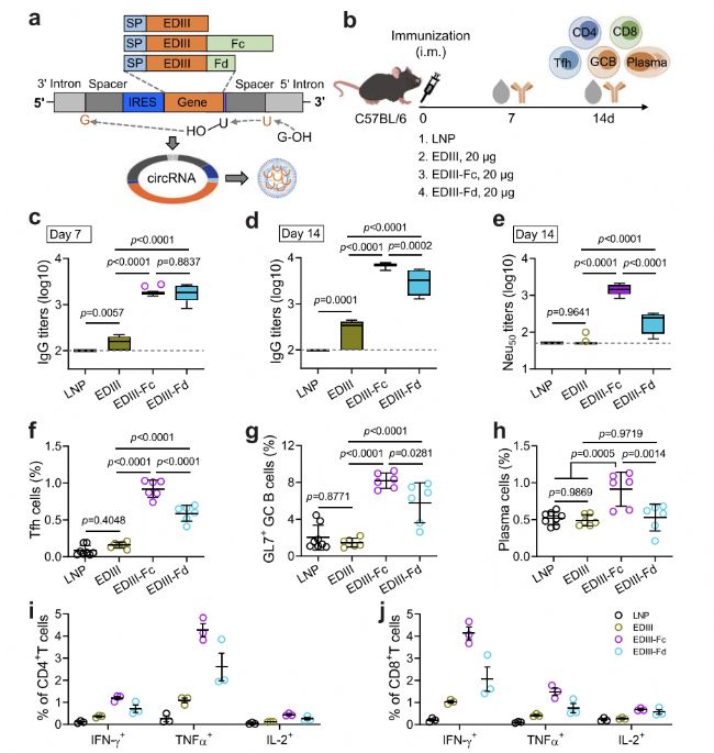 研究人員設(shè)計(jì)了編碼ZIKV包膜蛋白域III與人IgG1 Fc片段融合蛋白(EDIII-Fc)和非結(jié)構(gòu)蛋白1(NS1)的circRNA。結(jié)果顯示,EDIII-Fc circRNA比EDIII-Fd(三聚體形式)和單體EDIII circRNA表現(xiàn)出更好的免疫原性,誘導(dǎo)了更強(qiáng)的生發(fā)中心反應(yīng)和更高水平的中和抗體(圖1)。這一發(fā)現(xiàn)強(qiáng)調(diào)了抗原結(jié)構(gòu)在疫苗設(shè)計(jì)中的重要性。
