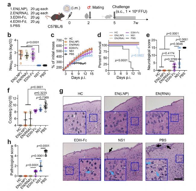 為提高疫苗保護(hù)作用,研究合成NS1 circRNA,并將等量EDIII-Fc和NS1的circRNA組合成兩種不同的配方:EN(LNP)是LNP分別包封兩種circRNA;EN(RNA)是LNP包封EDIII-Fc和NS1 circRNA的預(yù)混合物。將circRNA疫苗分別肌肉注射到C57BL/6小鼠體內(nèi),結(jié)果發(fā)現(xiàn)兩種配方的EDIII-Fc和NS1 circRNA的組合疫苗,與單獨(dú)circRNA相比,都可更好地保護(hù)新生兒免受寨卡病毒引起的癥狀和腦損傷。