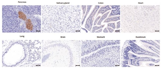 從hGLP1R小鼠(HO/HO)收集胰腺、唾液腺、結(jié)腸、心臟、肺、腦、胃和十二指腸,并用抗人GLP1R抗體進(jìn)行IHC分析,結(jié)果顯示hGLP1R在胰島中特異性高表達(dá)。