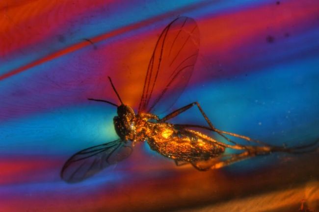 圖 3:波羅的海琥珀中的蒼蠅。雖然琥珀是一種無定形物質(zhì),理論上具有光學(xué)各向同性,但在偏振光下可以觀察到內(nèi)部應(yīng)變?cè)斐傻臉渲鲃?dòng)結(jié)構(gòu)以及夾雜物造成的應(yīng)變。偏振光和一階紅色補(bǔ)償器的使用使原本金黃的琥珀呈現(xiàn)出濃烈的色彩。暗場(chǎng)和入射光(玻璃纖維)、交叉偏振、一階紅色補(bǔ)償器、HDRI 色調(diào)映射的組合。由瑞士伯爾尼瑞士寶石學(xué)會(huì) Michael Hügi 提供。