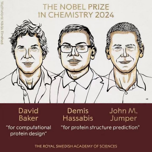 其中,一半獎項授予了華盛頓大學的大衛(wèi)·貝克,以表彰他在蛋白質設計領域的開創(chuàng)性貢獻。另一半則由谷歌旗下人工智能公司DeepMind的戴米斯·哈薩比斯和約翰·江珀共享,以表彰他們通過結合AI模型,在蛋白質結構預測中的非凡成就。
