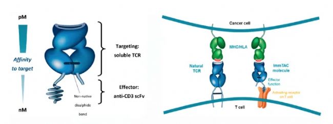 Tebentafusp的結(jié)構(gòu)(左)和作用機(jī)制(右)示意圖除此之外,Tebentafusp是使用Immunocore的ImmTAC技術(shù)平臺開發(fā)的第一個(gè)分子,旨在重定向和激活T細(xì)胞以識別和殺死腫瘤細(xì)胞。相比于單抗等其他腫瘤免疫療法靶向細(xì)胞表面蛋白,ImmTAC分子有望能夠靶向細(xì)胞內(nèi)和細(xì)胞外靶點(diǎn),激活針對癌細(xì)胞強(qiáng)有效且具特異性的T細(xì)胞應(yīng)答。
