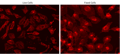 圖3.用10 µg/mL 的iFluor555小麥胚芽凝集素(WGA)探針(#25539)對(duì)活的和固定 HeLa 細(xì)胞染色 30 分鐘.用Cy7濾波片組在熒光顯微鏡獲取的圖像。