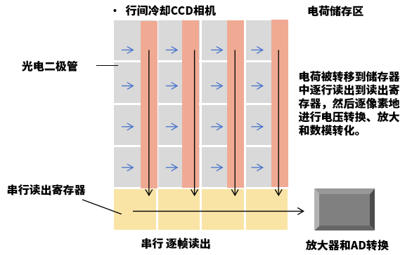 冷卻CCD是使用傳感器陣列設(shè)計(jì)的兩種技術(shù)中較老的一種。在最簡易的CCD陣列實(shí)現(xiàn)中,落在每個(gè)傳感器(像素)上的光被轉(zhuǎn)換為電子。在曝光結(jié)束時(shí),存儲在傳感器中的電子信號被順序地逐行轉(zhuǎn)移到讀出寄存器,然后逐幀放大并轉(zhuǎn)換為數(shù)字值(圖3)。