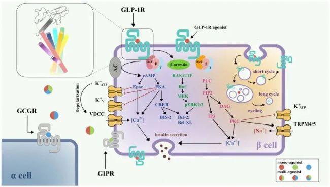 在胰島細胞中,GLP-1R的主要作用是促進胰島β細胞的增殖,刺激胰島素的合成與釋放,并抑制胰高血糖素的合成與釋放。