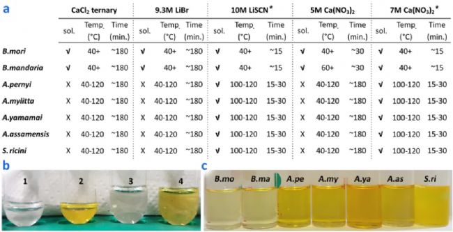 蠶絲一般由絲膠和絲素蛋白兩部分組成。絲膠是一種膠質(zhì)蛋白,主要由親水鏈組成,通?赏ㄟ^熱水或溫和的化學(xué)處理將其剝離。而絲素蛋白具有疏水性結(jié)構(gòu),富含短甘氨酸和丙氨酸殘基,可實(shí)現(xiàn)β片層緊密堆積和氨基酸R基互鎖排列,不易被溶解,且野生蠶絲比家蠶絲更難溶解。Bombyx蛋白包含重鏈(HC,390kDa)、輕鏈(LC,30kDa)和六肽(P25,25kDa),Antheraea和Samia蛋白僅包含通過二硫鍵連接的重鏈。為了充分溶解來自不同物種的絲素蛋白以便進(jìn)行更準(zhǔn)確的蛋白質(zhì)組學(xué)鑒定,作者配置了5種溶液體系,分別對B. mori、B. mandarina、A.pernyi、A. mylitta、A. yamamai、A. assamensis和S. ricini七種蠶絲進(jìn)行溶解測試(圖1a)。溶解效果通過黃色反應(yīng)測定(圖1b,c),結(jié)果顯示不同的鹽溶液對不同種類的絲素蛋白的溶解度不同,溶解所需的加熱溫度也因絲的類型而異。