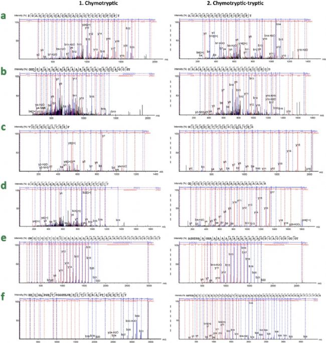 為了預(yù)估最佳的蛋白酶切方案,作者對Swiss-Prot庫中的B. mori(P05790)和B. mandarina(Q99059),TrEMBL庫中的A. pernyi(O75786)、 A. mylitta(Q8ISB3)、A. yamamai(E1CGA3)、A. assamensis(A0A0K0KR73)和S. ricini(A0A0D5ZYI3)進(jìn)行了氨基酸序列比對和計(jì)算機(jī)理論酶切。對比結(jié)果顯示,即使來自于同一個(gè)屬,不同物種間的蛋白也存在各自獨(dú)有的序列片段(圖2),從而導(dǎo)致在酶切過程中產(chǎn)生不同的肽段,輔助進(jìn)行物種區(qū)分。然后,作者在PeptideMass在線模擬Trypsin、Chymotrypsin和Trypsin-Chymotrypsin酶切覆蓋度。Trypsin和Chymotrypsin單獨(dú)酶切在不同樣品中的覆蓋度并不均勻,但Trypsin-Chymotrypsin聯(lián)合酶切比較穩(wěn)定,在B. mori HC中實(shí)現(xiàn)了48%的序列覆蓋率,在B. mandarina HC中實(shí)現(xiàn)了100%,在Antheraea中實(shí)現(xiàn)了92-100%,在S. ricini中實(shí)現(xiàn)了100%,這表明與單獨(dú)使用Trypsin相比,Trypsin-Chymotrypsin可為大多數(shù)絲素蛋白提供較高的多肽覆蓋率。