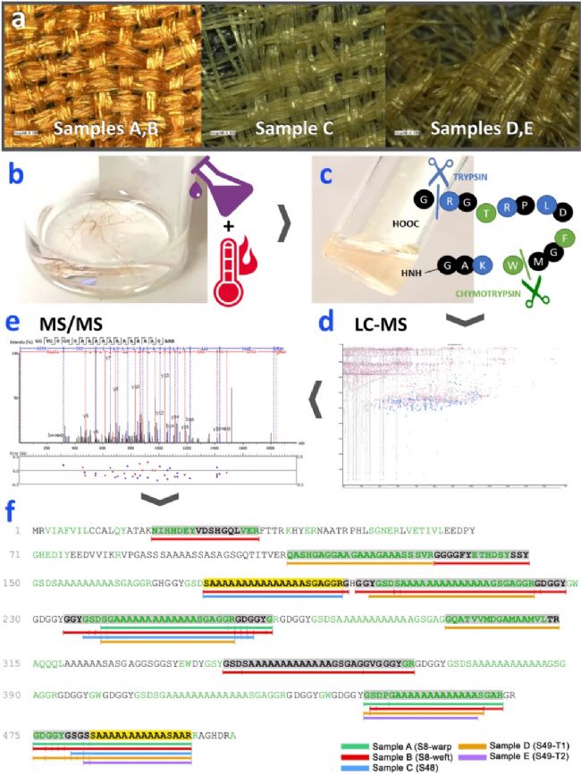 蠶絲是一種纖維蛋白,通常通過養(yǎng)殖家蠶(Bombyx mori)來生產(chǎn)。最早使用蠶絲制作紡織品的歷時(shí)可以追溯到大約6000年前中國的新石器時(shí)代[1]。歷史證據(jù)表明,與此同時(shí)或在此之前,可能已有多種蠶種被用于蠶絲采集和紡織品生產(chǎn)[2,3,4]。時(shí)至今日,多種野生蠶絲已被用于紡織品生產(chǎn),例如天蠶(Antheraea)和桑蠶(Samia)。這些物種適應(yīng)在不同的氣候條件下生活(從熱帶到溫帶),棲息在亞洲大部分地區(qū)并具有區(qū)域依賴性。絲綢是連接亞洲與中東和歐洲近 2000年的重要商品[1],在古絲綢之路及附近的考古遺址也發(fā)現(xiàn)了大量疑似絲綢的材料,對這些材料的種類進(jìn)行鑒定將有助于更好地了解古代和史前時(shí)期的絲綢生產(chǎn)概況,可以提供紡織品的使用、技術(shù)發(fā)展以及絲綢貿(mào)易的起源和發(fā)展的重要信息。然而,研究蠶桑業(yè)的起源很困難,因?yàn)榛趥鹘y(tǒng)的光學(xué)顯微鏡、SEM、FTIR等技術(shù)進(jìn)行形態(tài)觀察和化學(xué)表征很難捕捉到蠶絲物種間的細(xì)微變化,古代樣品由于發(fā)生氧化和降解等反應(yīng),使得難度進(jìn)一步提高。通過LC-MS/MS可以確定氨基酸序列,然后可以通過遺傳和蛋白質(zhì)組數(shù)據(jù)庫在物種水平上將其與特定蛋白質(zhì)匹配[5],還可以觀察到由于遺傳漂變和物種形成而導(dǎo)致的同一蛋白質(zhì)在不同物種中發(fā)生氨基酸序列變化[6,7]。