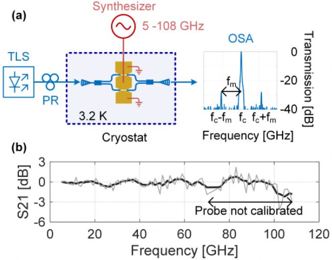 低溫裝置由一個在推拉模式下操作的等離子體馬赫-曾德爾調制器組成。該裝置的示意圖如圖1(a)所示。等離子體馬赫-曾德爾調制器的兩個臂上有等離子移相器,每個槽寬為130 nm,長度為15 um。等離子體馬赫-曾德爾調制器通過光柵耦合器實現(xiàn)與光子集成電路(PIC)芯片的光學耦合。為了方便光學對準,使用與低溫兼容的環(huán)氧膠將光纖陣列(FA)粘附到PIC上。等離子體馬赫-曾德爾調制器具有兩臂之間的不平衡,引入了一個固定的相移。這允許在不需要電學調節(jié)的情況下調整調制器的工作點,例如通過熱光相移器,避免了給低溫恒溫器增加額外的熱負載。相位調制是利用有機電光(OEO)材料的線性電光效應實現(xiàn)的。OEO材料已被證明在4.2 K下表現(xiàn)出高非線性,該裝置的特點是在室溫和4k環(huán)境下的頻率響應。圖1(a)描述了等離子體馬赫-曾德爾調制器的實驗裝置圖。圖1(b)顯示了在4 K溫度下從5 GHz到108 GHz的近乎平坦的頻率響應。更準確地說,樣品被放置在一個4 k閉環(huán)液氦低溫恒溫器中。一個安裝在樣品臺頂部的溫度傳感器測量了靠近芯片的溫度。每次實驗前,PIC芯片被保持在3.2 K超過12小時,以確保達到穩(wěn)態(tài)溫度。一個來自可調諧激光源(TLS)的1532.5 nm光載波被連接到了被測試設備(DUT)。等離子體馬赫-曾德爾調制器的工作點被設置在其正交點(3 dB)。為了確定電光響應,一個電學正弦信號(5–108 GHz)通過一個67 GHz真空射頻穿透件和射頻探針被送入等離子體馬赫-曾德爾調制器。信號是利用一個合成器產生的,頻率高達70 GHz,超過此頻率的部分使用了額外的倍頻器。設置的電學損耗(不包括探針)在室溫下使用電氣頻譜分析儀進行了表征,并考慮了校準。等離子體馬赫-曾德爾調制器的調制輸出信號使用光譜分析儀(OSA)進行了記錄。需要強調的是,使用了67 GHz探針進行測量,并且已經校準到67 GHz。對于更高的頻率,校準已經標準化到67 GHz的損耗值。67 GHz以上更明顯的振蕩很可能是由于未校準的適當針頭造成的。黑色實線所示的測量平均頻率顯示了108 GHz的頻率響應,2.2 dB 下降。