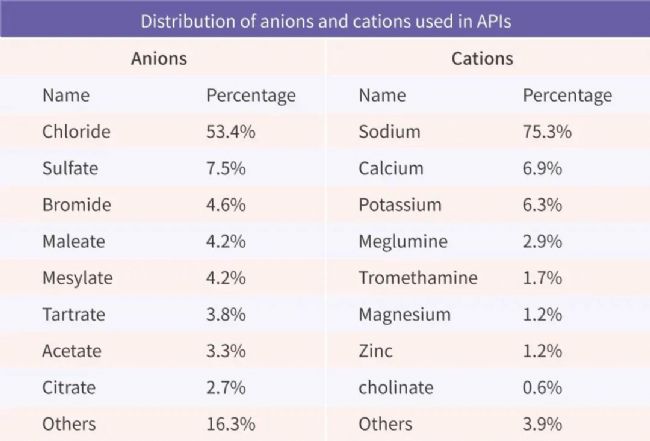 表 1. 原料藥中常見(jiàn)陰離子和陽(yáng)離子的分布。