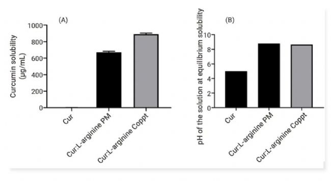 姜黃素和姜黃-L-精氨酸物理混合物 (PM) 和共沉淀物 (Coppt) 溶液在平衡時(shí)的溶解度 (A) 和 pH 值 (B)。