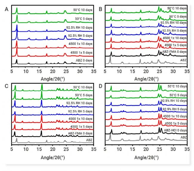 4500 lux、92.5% 相對(duì)濕度以及 50℃ 的條件下,在 0 天、5 天和 10 天對(duì)阿苯達(dá)唑(A)、阿苯達(dá)唑-富馬酸(B)、阿苯達(dá)唑-酒石酸(C)和阿苯達(dá)唑-鹽酸(D)樣品進(jìn)行實(shí)驗(yàn)性粉末X射線衍射(PXRD)測(cè)試的數(shù)據(jù)。
