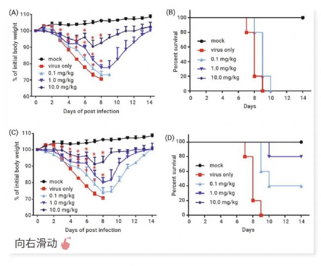七周的雌性小鼠感染 maPR8 流感病毒,病毒劑量為 5 MLD50 (小鼠致死劑量)。然后,口服給予 0.1、1 或 10 mg/kg Oseltamivir free base (A 和 B) 或 Oseltamivir phosphate (C 和 D),每天兩次,連續(xù) 5 天。感染后 14 天內(nèi),評(píng)估體重變化 (A 和 C) 和生存率 (B 和 D)。*P < 0.05。小鼠肺切片 (放大倍數(shù),100×) 在感染后 7 天用蘇木精-伊紅染色 (E)。箭頭指示小血管和細(xì)支氣管周圍的間質(zhì)水腫和炎癥細(xì)胞浸潤(rùn),以及肺泡腔。箭頭指示小血管出血。