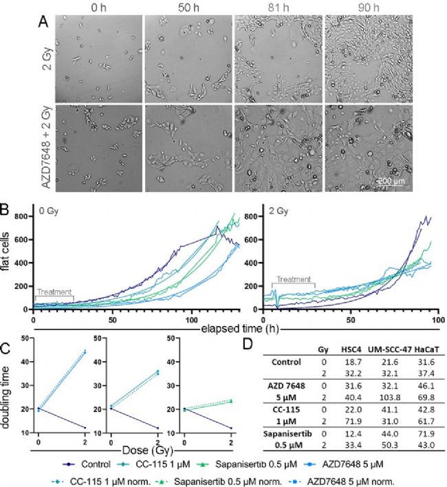 圖 1 zenCELL owl對(duì)9種細(xì)胞系(7種HNSCC細(xì)胞系:Cal33、CLS-354、Detroit 562、HSC4、RPMI-2650、UD-SSC-2、UM-SSC-47,2種健康組織細(xì)胞系:01-GI-SBL、SBLF9)在經(jīng)Xevinapan、電離輻射(IR)單獨(dú)或聯(lián)合處理下的動(dòng)態(tài)變化過程的監(jiān)測(cè)的(A)、(B)、(D).圖片、生長曲線等數(shù)據(jù),并據(jù)此計(jì)算 (C) “倍增時(shí)間”