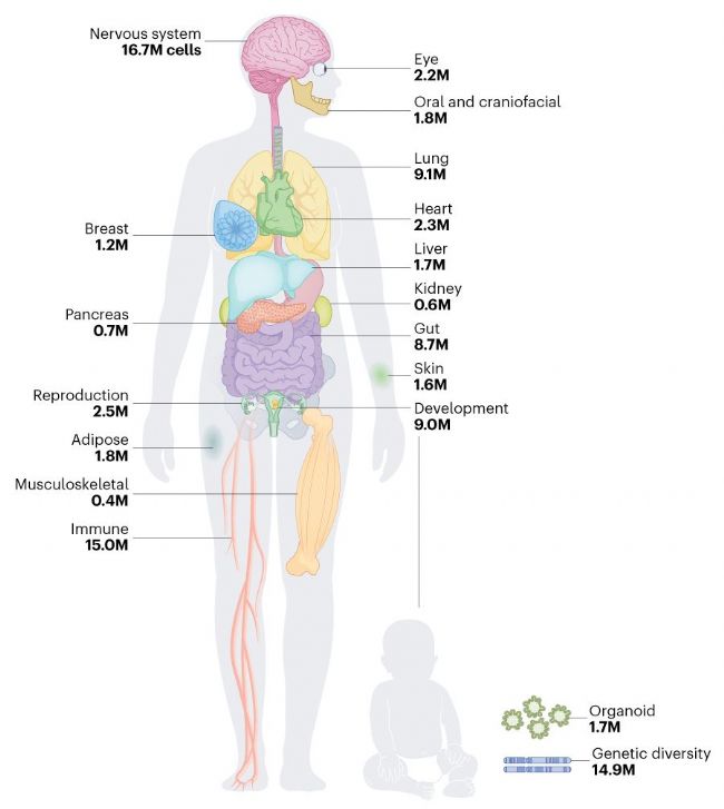 人類細(xì)胞圖譜(Human Cell Atlas, HCA)聯(lián)盟成立于2016年,旨在構(gòu)建人體每一個(gè)細(xì)胞的生物圖譜。自2017年發(fā)布白皮書以來,該聯(lián)盟已發(fā)展成為一個(gè)擁有102個(gè)國(guó)家3600多名成員的全球網(wǎng)絡(luò),為18個(gè)生物網(wǎng)絡(luò)提供數(shù)據(jù)。HCA數(shù)據(jù)門戶網(wǎng)站目前擁有從約9,100名捐贈(zèng)者收集的約6,200萬個(gè)細(xì)胞的數(shù)據(jù)。為便于數(shù)據(jù)整合,該聯(lián)盟正在構(gòu)建18個(gè)HCA生物網(wǎng)絡(luò)圖譜,如圖1所示。每個(gè)網(wǎng)絡(luò)整合了與單個(gè)組織或器官相關(guān)的所有可用HCA數(shù)據(jù)。