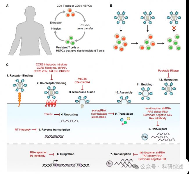 圖20. 傳統(tǒng)的HIV基因治療.(A) 體外基因遞送[17]。使用合適的載體在體外對(duì)自體CD4+ T細(xì)胞或CD34+造血干祖細(xì)胞(HSPCs)進(jìn)行基因修飾。修飾后的基因細(xì)胞被輸注回患者體內(nèi)。 (B) 基因修飾HIV靶細(xì)胞的陽(yáng)性選擇。HIV在易感的HIV靶細(xì)胞(紅色)中復(fù)制;蛐揎椀募(xì)胞(綠色)對(duì)感染具有抵抗力,并累積到具有治療意義的水平。 (C) HIV復(fù)制周期和基因治療示例。RT,HIV逆轉(zhuǎn)錄酶;IN,HIV整合酶。
