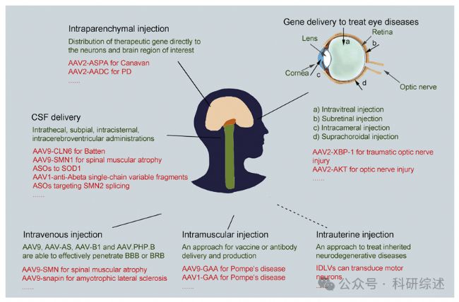 圖21. 基因治療在神經(jīng)退行性疾病中的遞送途徑 [18]。盡管通過(guò)靜脈注射或腦脊液(鞘內(nèi)、腦室內(nèi)和腦膜下路徑)給藥可以有效治療多灶性疾病,但實(shí)質(zhì)內(nèi)注射是腦部疾病最常用的遞送途徑。對(duì)于眼部疾病來(lái)說(shuō),局部基因遞送更為優(yōu)選,因?yàn)槠涫中g(shù)和器械操作相對(duì)簡(jiǎn)單。肌內(nèi)注射提供了一種疫苗和抗體遞送及生產(chǎn)的策略,而子宮內(nèi)注射可能為治療遺傳性神經(jīng)退行性疾病提供一種方法。